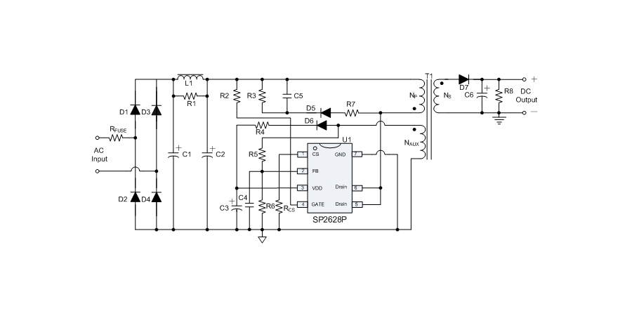 SP2628P is a high performance offline PSR power switch for low power AC/DC charger and adapter applications. It operates in primary-side sensing and regulation. Thus, opto-coupler and TL431 are not required. In CC control, the output current and power setting can be adjusted externally by the sense resistor RCS at CS PIN. In CV control, multi-mode operations are utilized to achieve high performance and high efficiency. In addition, good load regulation is achieved by the built-in cable drop compensation. SP2628P operates in PFM in CC mode, and it operates in PWM+PFM in CV mode with frequency reduction at light/medium load. The chip consumes very low operation current. It achieves less than 50mW standby power to meet strict standby power standard.