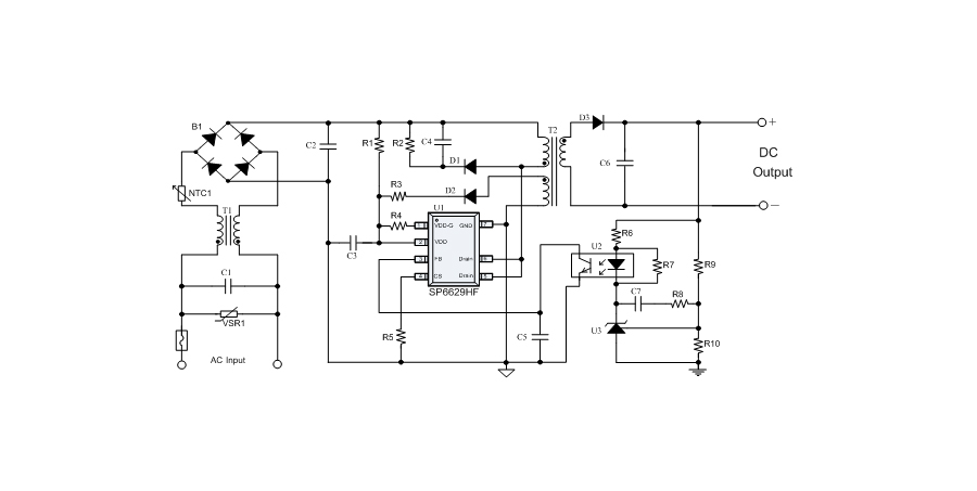 SP6629HF在PWM模式下工作于固定頻率,這個(gè)頻率是由內(nèi)部精確設(shè)定的。在空載或者輕載時(shí),工作頻率由IC內(nèi)部調(diào)整。芯片可以工作在綠色模式,以此來減小輕載時(shí)的損耗,提高整機(jī)的工作效率,SP6629HF在啟動(dòng)和工作時(shí)只需要很小的電流,可以在啟動(dòng)電路中使用一個(gè)很大的電阻,以此來進(jìn)一步減小待機(jī)時(shí)的功耗。芯片內(nèi)置有斜坡補(bǔ)償電路,當(dāng)電路工作于大占空比時(shí),避免次諧波振蕩的發(fā)生,改善系統(tǒng)的穩(wěn)定性。內(nèi)置有前沿消隱時(shí)(Leading-edge blanking time),消除緩沖網(wǎng)絡(luò)中的二極管反向恢復(fù)電流對電路的影響。SP6629HF采用了抖頻技術(shù),能夠有效改善系統(tǒng)的EMI性能。系統(tǒng)的跳頻頻率設(shè)置在音頻(20KHz)以上,在工作時(shí)可以避免系統(tǒng)產(chǎn)生噪音。SP6629HF內(nèi)置多種保護(hù),包括逐周期限流保護(hù)(OCP),過載保護(hù)(OLP),過壓保護(hù)(OVP),VDD過壓箝位,欠壓保護(hù)(UVLO),過溫保護(hù)(OTP)等,通過內(nèi)部的圖騰柱驅(qū)動(dòng)結(jié)構(gòu)可以更好的改善系統(tǒng)的EMI特性和開關(guān)的軟啟動(dòng)控制。SP6629HF使用SOP7無鉛封裝。