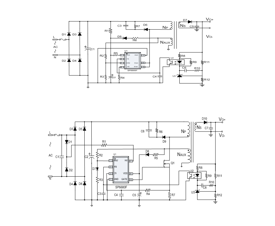 SP6668F內置多種保護,包括:輸入電壓過低保護(Brown-out),輸入電壓過高保護(Line-ovp),輸出電壓過壓保護(VO_OVP),輸出二極管短路保護,逐周期過流保護(OCP),過載保護(OLP),VDD過壓保護(OVP),VDD欠壓保護(UVLO),過溫保護(OTP)等。