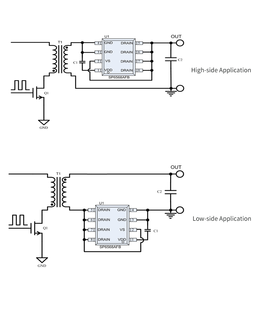 SP6568AFB是一顆高性能的開關電源次級側同步整流控制電路。在低壓大電流開關電源應用中,輕松滿足6級能效,是理想的超低導通壓降整流器件的解決方案。芯片可支持高達150KHz的開關頻率應用,并且支持CCM / QR / DCM等開關電源工作模式應用,其極低導通壓降產生的損耗遠小于肖特基二極管的導通損耗,極大提高了系統的轉換效率,大幅降低了整流器件的溫度。